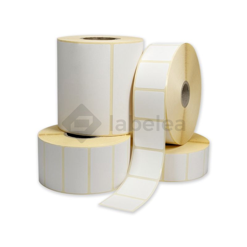 Bílé papírové samolepicí štítky pro termotransferový tisk. Etikety navinuté na malé roli s průměrem do 125 mm, vhodné pro stolní tiskárny.