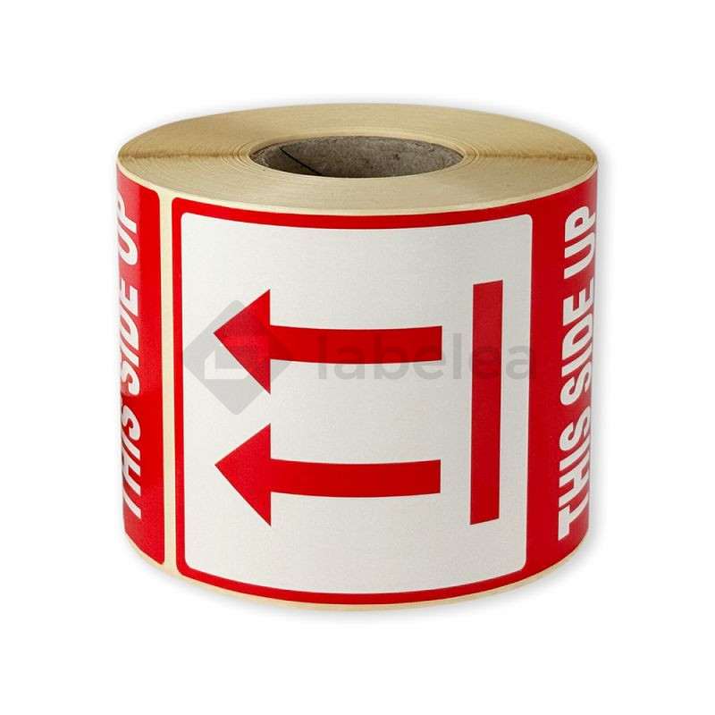 Papierové výstražné samolepiace štítky s červenou tlačou. Štítok upozorňuje na krehký obsah a spôsob, ako s ním zaobchádzať.