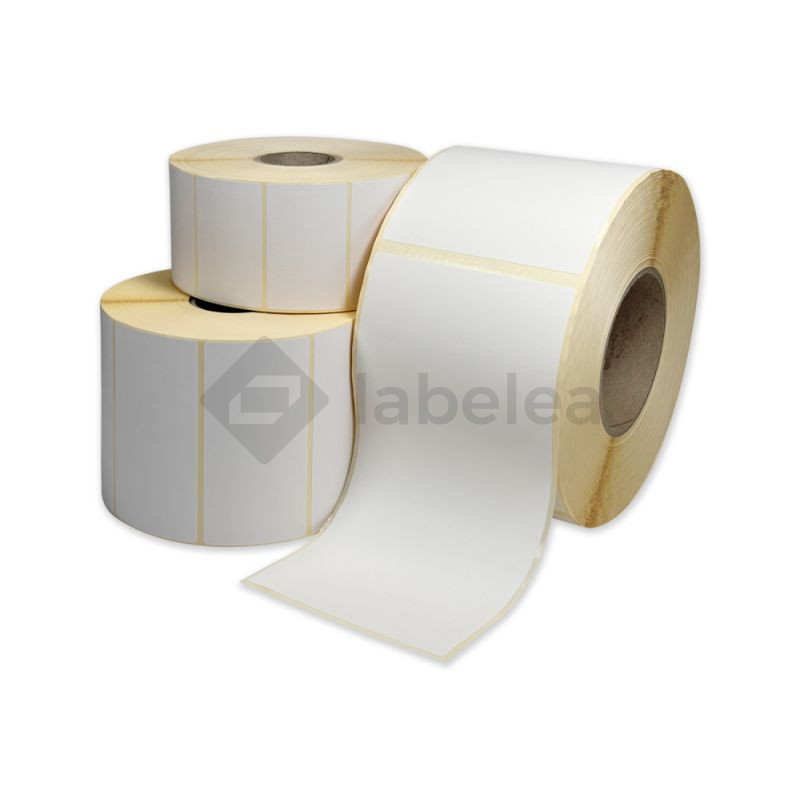 Biele papierové samolepiace štítky pre termotransferovú tlač. Etikety navinuté na veľkú rolku s priemerom do 180 mm sú vhodné pre priemyselné tlačiarne.